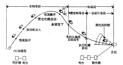 例如蘇制紅土地炮彈作戰(zhàn)時使用教范要求,觀察員照射點(diǎn)距離目標(biāo)約5公里處,要求觀察員與火炮夾角不能大于45度(750密位),觀察員與目距離不能大于5000米,在條件許可的情況下,應(yīng)盡量把觀察點(diǎn)設(shè)在火炮目標(biāo)方向夾角為正負(fù)100密位(6度)的扇形區(qū)外,以免被炮彈掉下來的部件(譬如脫落的鼻錐)誤傷。先由前沿觀察員搜索、確定所要攻擊的目際、測定其距離和方位,用無線電通報發(fā)射陣地,指揮發(fā)射。炮彈出炮口后25米左右穩(wěn)定尾翼張開到位,5~10秒后火箭助推發(fā)動機(jī)開始工作,當(dāng)彈丸接近彈道頂點(diǎn),程控裝置按預(yù)先裝定的時間使慣性陀螺解鎖,開始測量下滑角。彈丸在升弧段及一部分降弧段是無控飛行的。當(dāng)下滑角達(dá)24°時,自動駕駛儀工作,彈丸進(jìn)入慣性制導(dǎo)階段,保持其下滑角不變。與此同時,保護(hù)鼻錐部脫落,自動導(dǎo)引頭作好準(zhǔn)備。在炮彈距目標(biāo)約3000米,也就是在彈道未段的6~15秒時間內(nèi),由同步器或手動計時啟動激光測距/目標(biāo)指示器,對目標(biāo)進(jìn)行照射。彈上的激光導(dǎo)引頭可搜索地面直徑為1千米區(qū)域內(nèi)的激光反射信號,當(dāng)導(dǎo)引頭接收到目標(biāo)反射來的足夠強(qiáng)度的激光編碼信號后,即捕獲到目標(biāo)并激活導(dǎo)引頭位標(biāo)器,導(dǎo)引頭陀螺解鎖加速旋轉(zhuǎn)并進(jìn)入跟蹤狀態(tài),導(dǎo)引頭給出含有重力補(bǔ)償?shù)谋壤龑?dǎo)引信號,靠舵片操縱炮彈自動導(dǎo)向日標(biāo),當(dāng)接近自標(biāo)數(shù)百米時從低伸彈道轉(zhuǎn)入俯沖彈道,以35~45°的著角攻擊目標(biāo)頂部,隨即延遲引信引爆戰(zhàn)斗部,摧毀目標(biāo)。