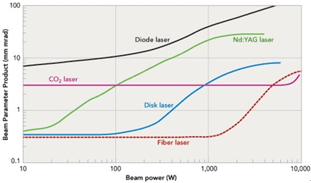 圖 1 指出不同工業激光的光束質量參數(BPP) 與輸出功率的關系。其中BPP 值越小表明光束質量越好。與其它激光相比,光纖激光表現出更好的光束質量(只有在5千到一萬瓦范圍內略遜于二氧化碳激光器)。 我們一致認為,光纖激光具有更為廣闊的未來。